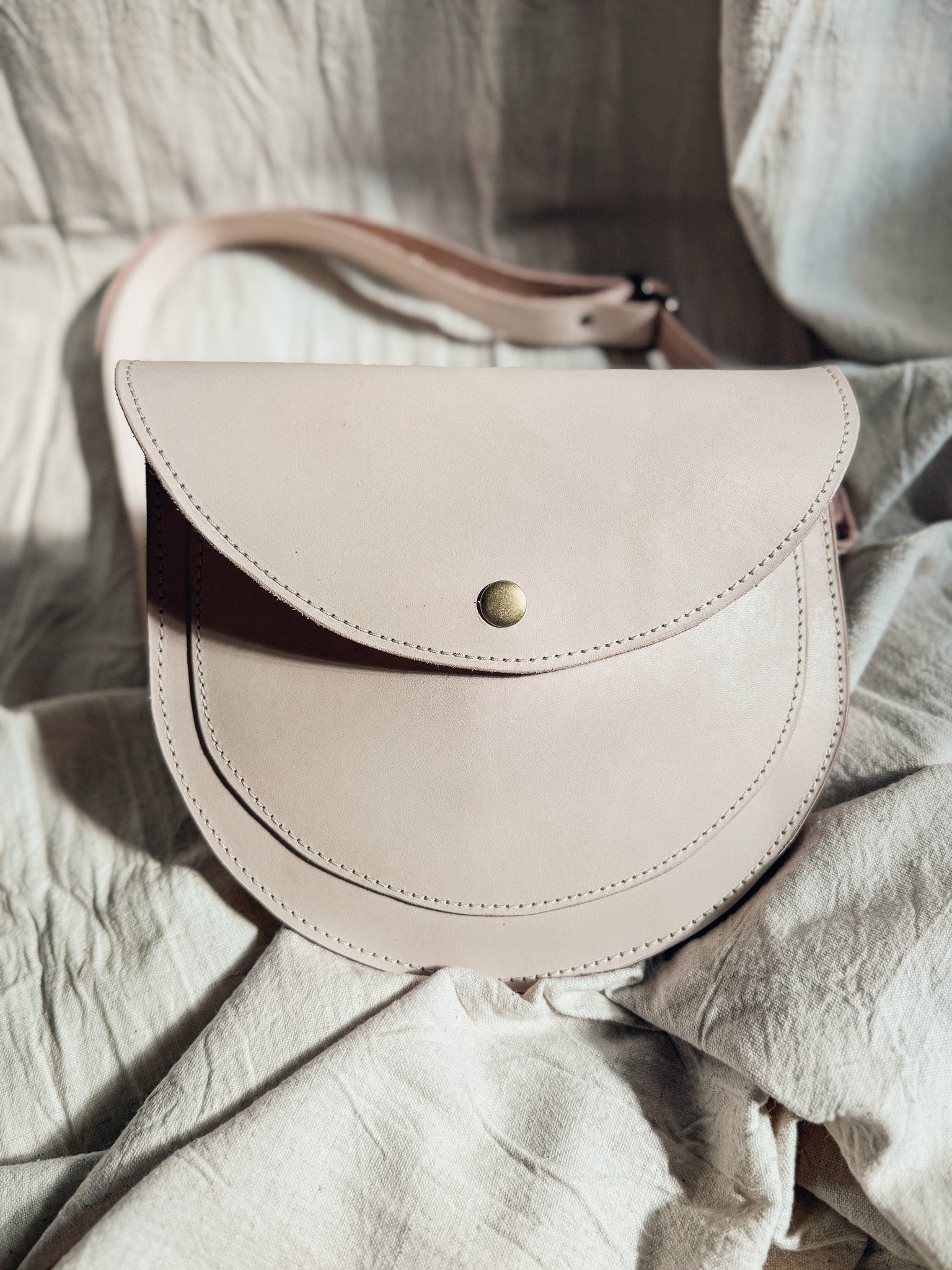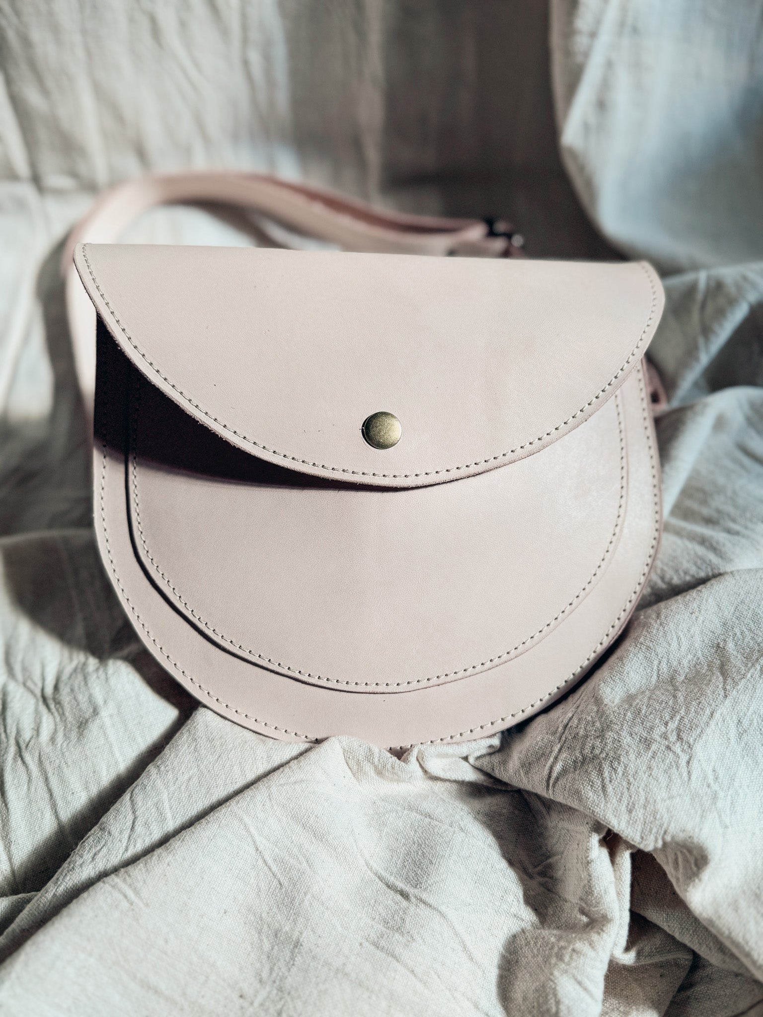 A smaller version of our large half moon bag. This one is for carrying just the essentials. Crafted from premium vegetable-tanned leather, this half-circle purse offers a timeless, minimalist design that only gets better with age. The front pocket provides easy access to smaller items, while the secure magnetic snap closure keeps your belongings safe. An adjustable strap allows for a comfortable fit whether worn crossbody, on your hip or over the shoulder. Elegant and versatile, this purse is perfect for everyday use or a polished finishing touch to any outfit.