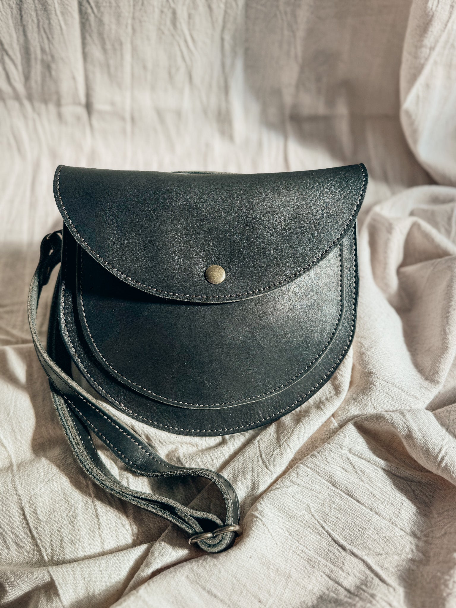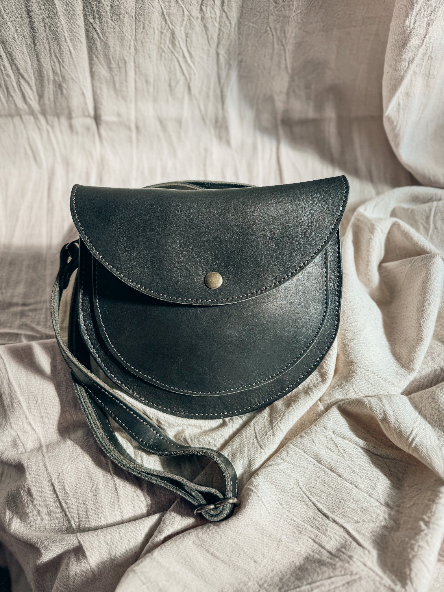 A smaller version of our large half moon bag. This one is for carrying just the essentials. Crafted from premium vegetable-tanned leather, this half-circle purse offers a timeless, minimalist design that only gets better with age. The front pocket provides easy access to smaller items, while the secure magnetic snap closure keeps your belongings safe. An adjustable strap allows for a comfortable fit whether worn crossbody, on your hip or over the shoulder. Elegant and versatile, this purse is perfect for everyday use or a polished finishing touch to any outfit.