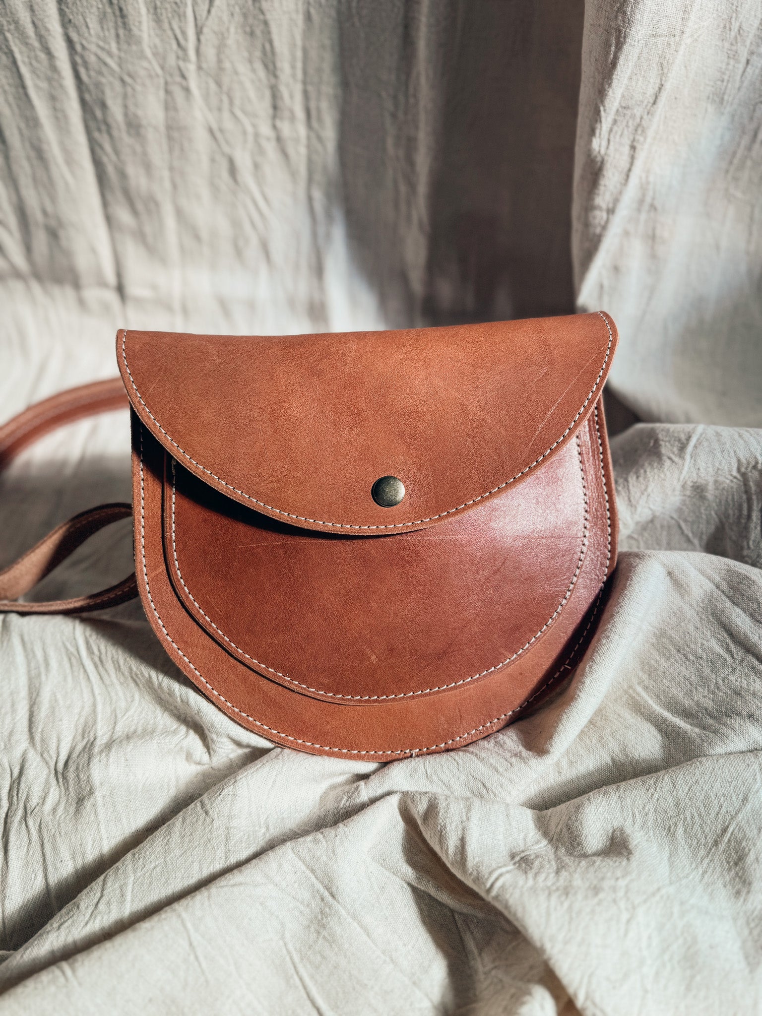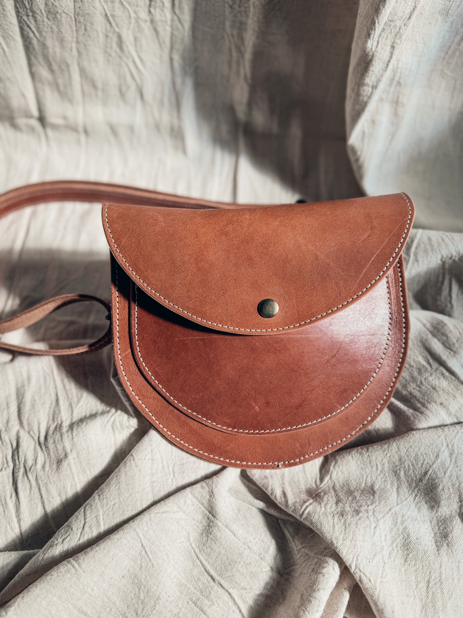 A smaller version of our large half moon bag. This one is for carrying just the essentials. Crafted from premium vegetable-tanned leather, this half-circle purse offers a timeless, minimalist design that only gets better with age. The front pocket provides easy access to smaller items, while the secure magnetic snap closure keeps your belongings safe. An adjustable strap allows for a comfortable fit whether worn crossbody, on your hip or over the shoulder. Elegant and versatile, this purse is perfect for everyday use or a polished finishing touch to any outfit.