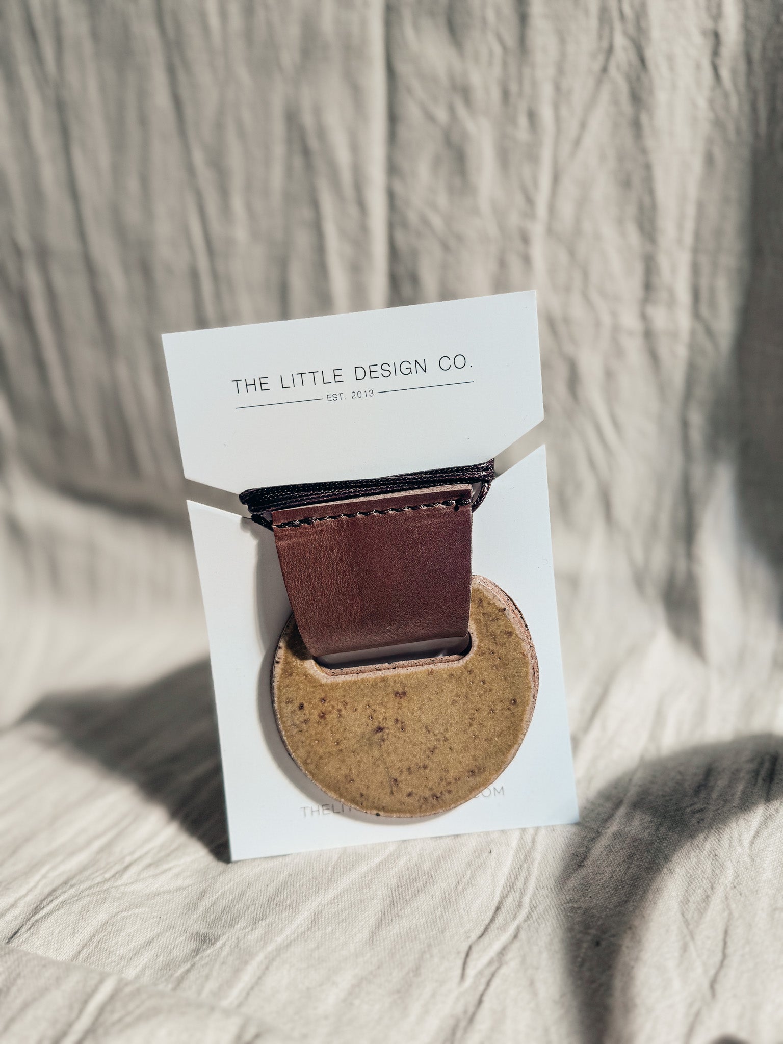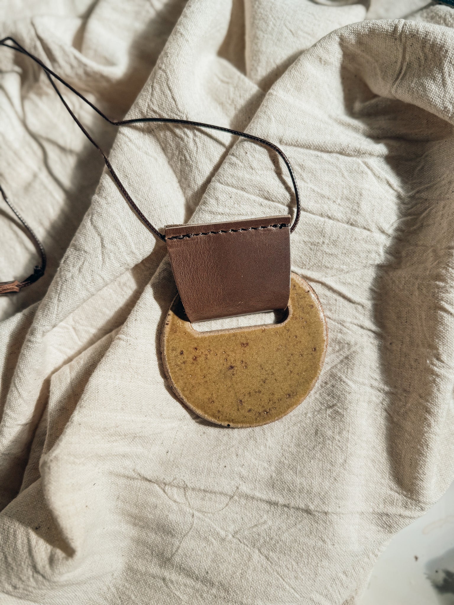 A handcrafted ceramic pendant rests elegantly on a supple leather piece, combining earthy charm with timeless simplicity. The necklace is fully adjustable, allowing you to customize the length for the perfect fit—extending up to an 18" drop. Lightweight and versatile, this necklace is ideal for everyday wear or layering with your favorite pieces.