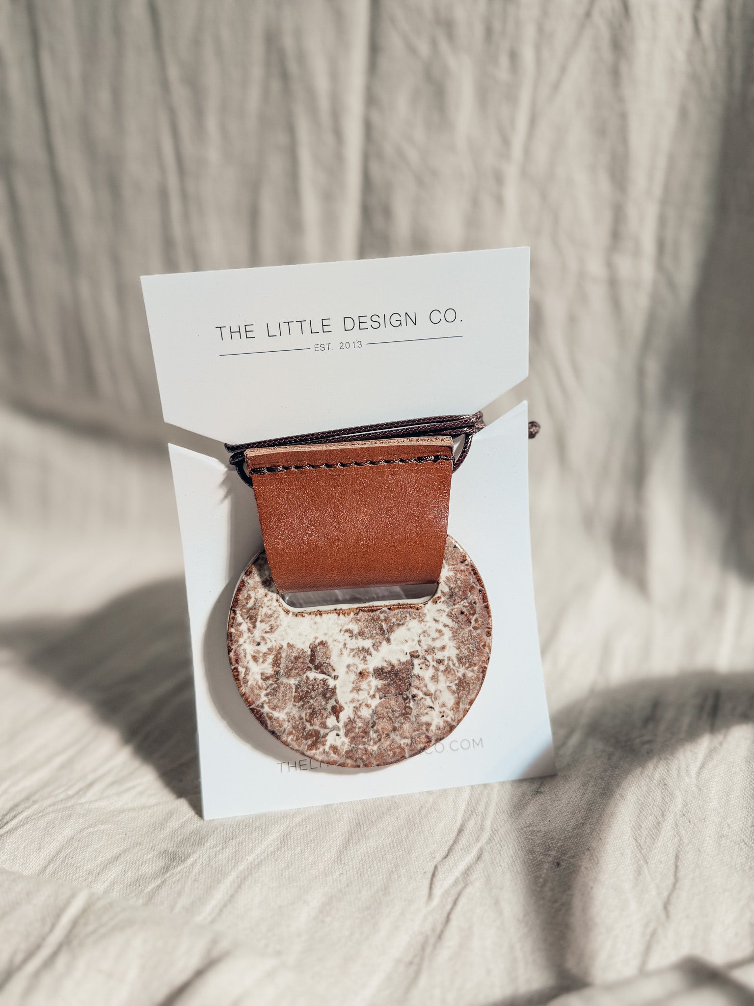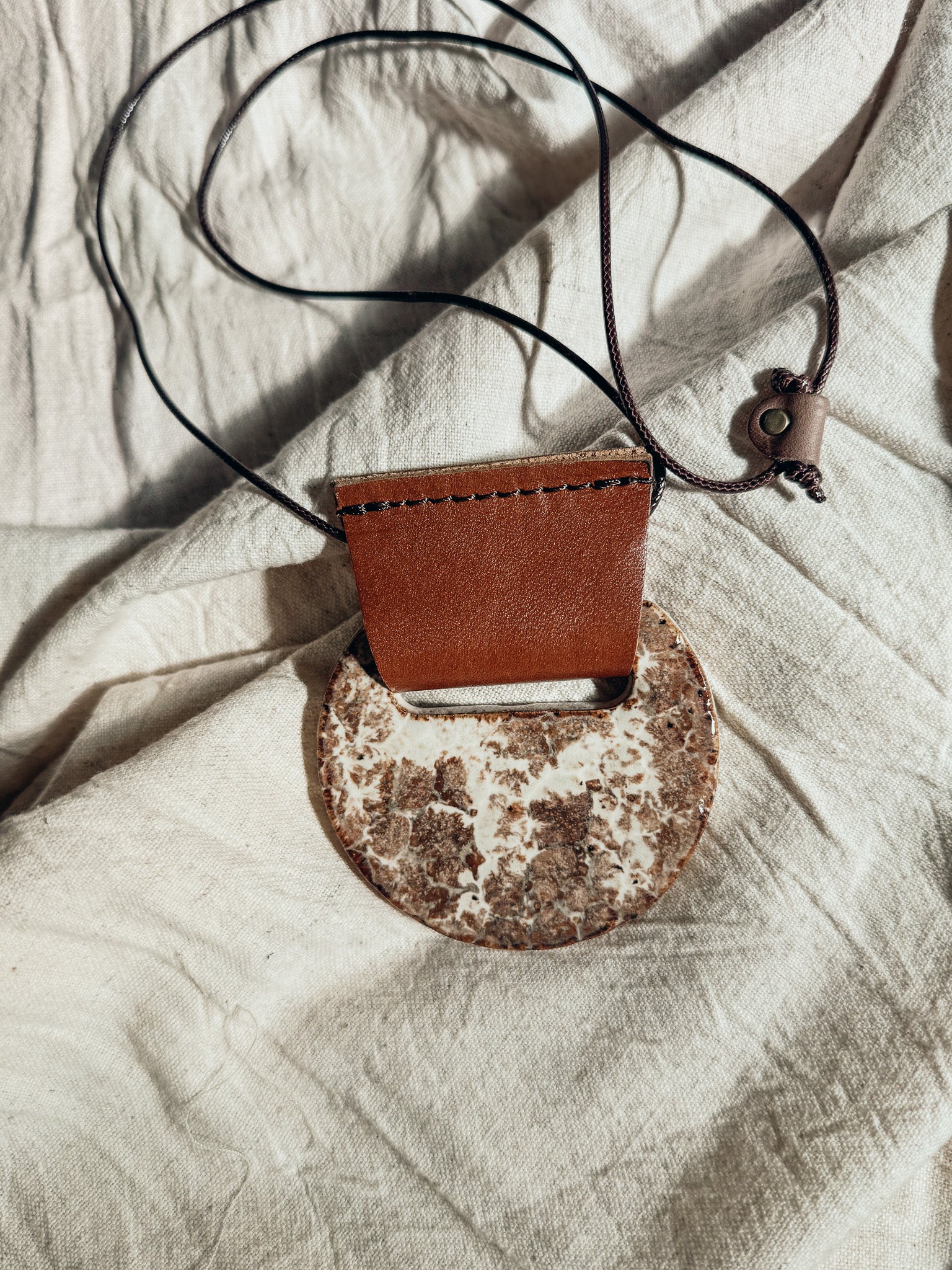 A handcrafted ceramic pendant rests elegantly on a supple leather piece, combining earthy charm with timeless simplicity. The necklace is fully adjustable, allowing you to customize the length for the perfect fit—extending up to an 18" drop. Lightweight and versatile, this necklace is ideal for everyday wear or layering with your favorite pieces.